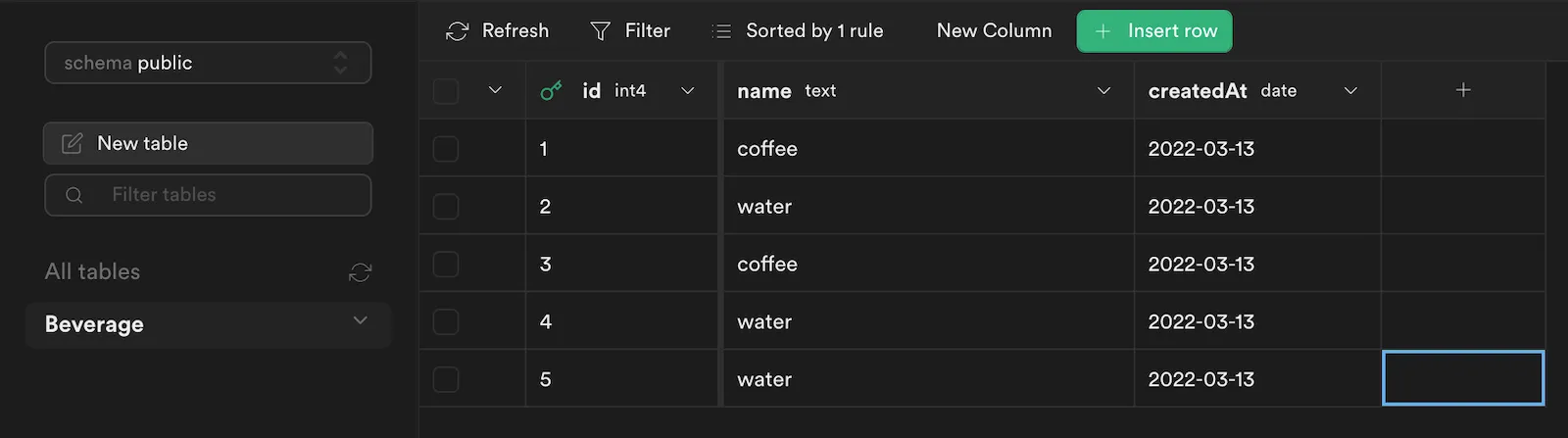 If you go to Supabase and into your project, you will now see that there is a Beverage table in your database. While we’re here let’s go ahead and add some dummy data.